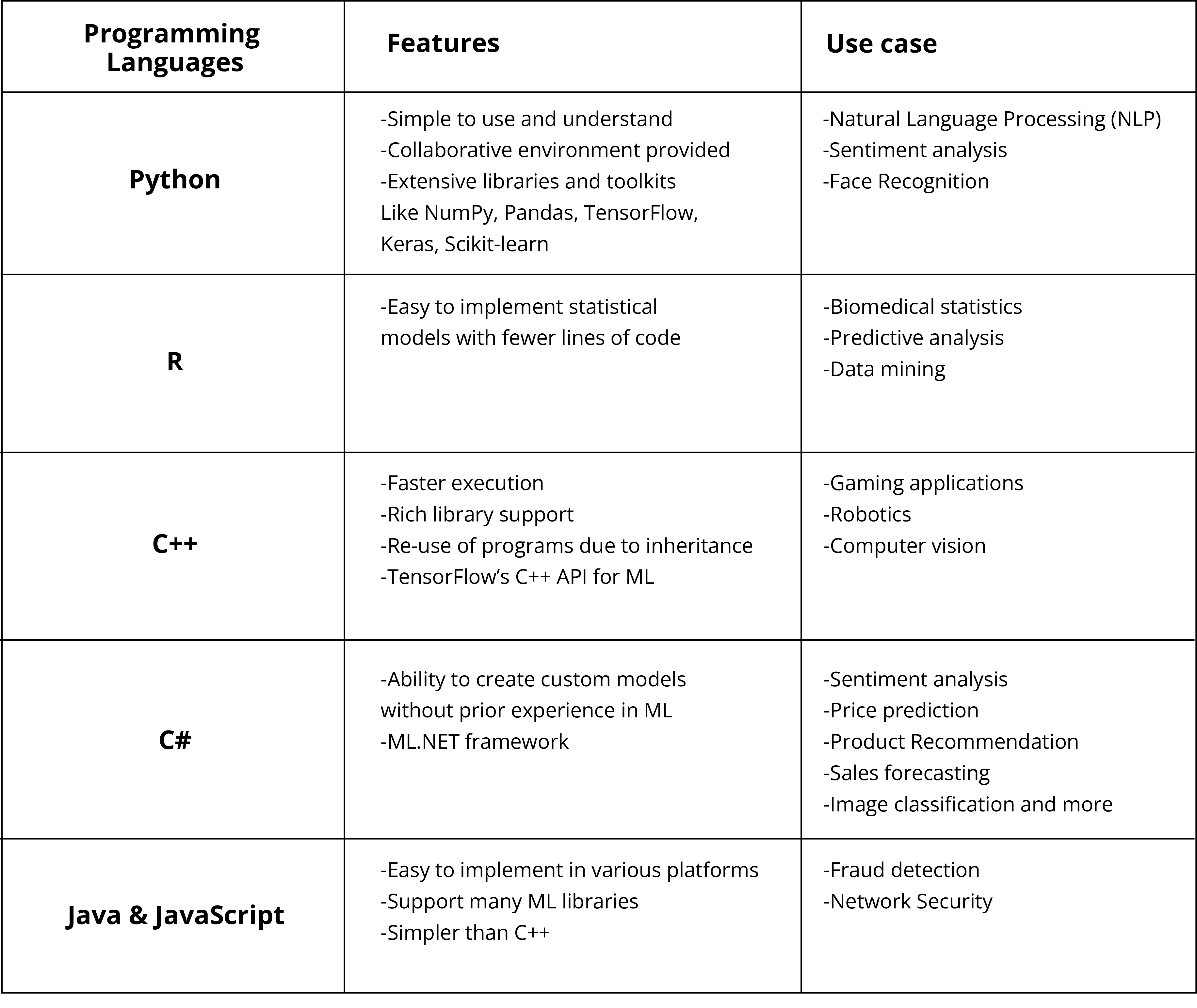 One of the significant factors in deciding the programming language for your machine learning is the end goal of your project. Here we will discuss the main programming languages that can be used for Machine Learning, along with the associated use cases to see the effectiveness of each in different domains.